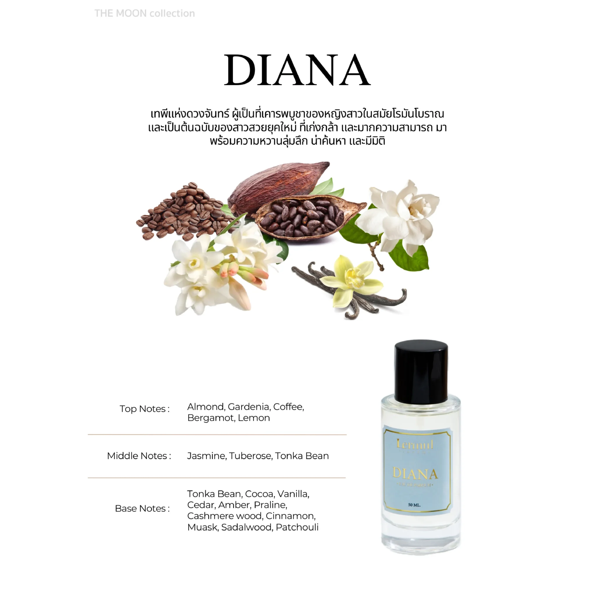 Diana เทพีแห่งดวงจันทร์และการล่าสัตว์ ผู้เป็นที่เคารพบูชาของหญิงสาวในสมัยโรมันโบราณและเป็นต้นฉบับของสาวสวยยุคใหม่ที่เก่งกล้าและมากความสามารถ มาพร้อมความหวานลุ่มลึก น่าค้นหา และมีมิติ