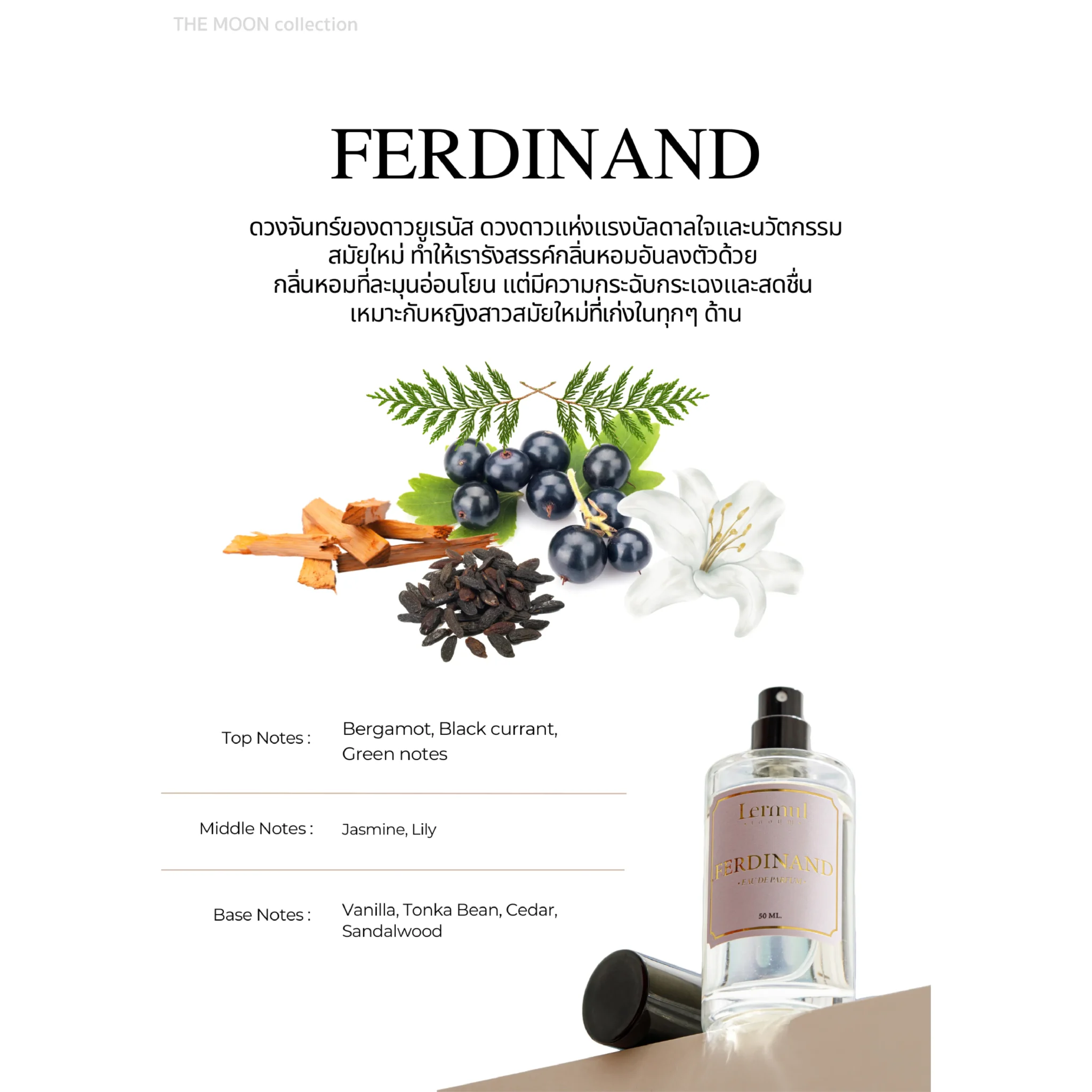 Ferdinand ดวงจันทร์ของดาวยูเรนัส ดวงดาวแห่งแรงบัลดาลใจและนวัตกรรมสมัยใหม่ ทำให้เรารังสรรค์กลิ่นหอมอันลงตัว ด้วยกลิ่นหอมที่ละมุนอ่อนโยน แต่มีความกระฉับกระเฉงและสดชื่น เหมาะกับหญิงสาวสมัยใหม่ที่เก่งในทุกๆด้าน