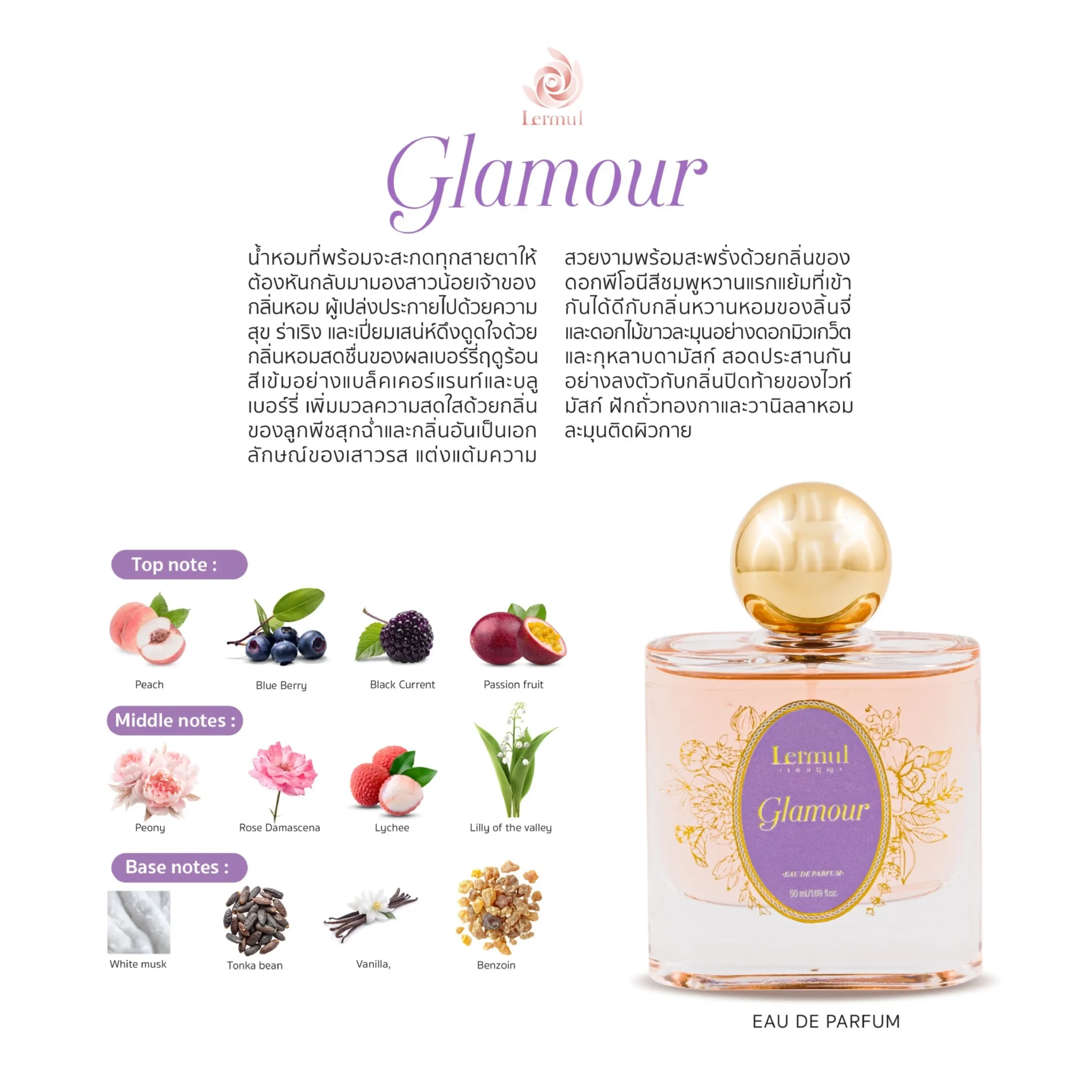 น้ำหอมที่พร้อมจะสะกดทุกสายตาให้ต้องหันกลับมามองสาวน้อยเจ้าของกลิ่นหอม ผู้เปล่งประกายไปด้วยความสุข ร่าเริง และเปี่ยมเสน่ห์ดึงดูดใจด้วยกลิ่นหอมสดชื่นของผลเบอร์รี่ฤดูร้อนสีเข้มอย่างแบล็คเคอร์แรนท์และบลูเบอร์รี่ เพิ่มมวลความสดใสด้วยกลิ่นของลูกพีชสุกฉ่ำและกลิ่นอันเป็นเอกลักษณ์ของเสาวรส แต่งแต้มความสวยงามพร้อมสะพรั่งด้วยกลิ่นของดอกพีโอนีสีชมพูหวานแรกแย้มที่เข้ากันได้ดีกับกลิ่นหวานหอมของลิ้นจี่ และดอกไม้ขาวละมุนอย่างดอกมิวเกว็ตและกุหลาบดามัสก์ สอดประสานกันอย่างลงตัวกับกลิ่นปิดท้ายของไวท์มัสก์ ฝักถั่วทองกา และวานิลลาหอมละมุนติดผิวกาย The real breath-taking perfume that would grabbing all the attention to its owner. A young lively lady who glamourously shines and surrounded with blissed joy. Sweet appealing with the sunny summer berries scents of black currant and blueberry. Overwhelming the happiness by sweetest note of ripe peach and a distinctive passion fruit. Blooming beautifully of pink peony flower tinge, candied lychee, and the fine white floral scents of muguet and Damask rose. Perfectly blende with white musk, tonka bean, and delicate vanilla to rest of thy skin.