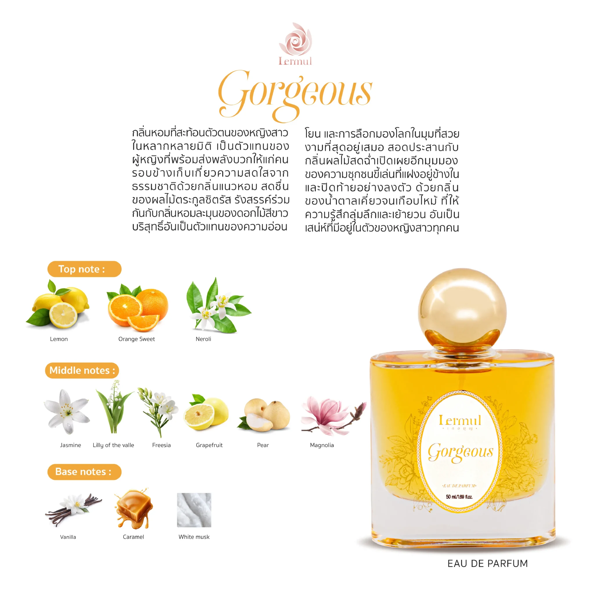 กลิ่นหอมที่ตั้งใจสะท้อนตัวตนของหญิงสาวในหลากหลายมิติ เป็นตัวแทนของผู้หญิงที่พร้อมส่งพลังบวกให้แก่คนรอบข้าง เก็บเกี่ยวความสดใสจากธรรมชาติด้วยกลิ่นแนวหอม สดชื่น ของผลไม้ตระกูลซิตรัส รังสรรค์ร่วมกันกับกลิ่นหอมละมุนของดอกไม้สีขาวบริสุทธิ์อันเป็นตัวแทนของความอ่อนโยนและการเลือกมองโลกในมุมที่สวยงามที่สุดอยู่เสมอ สอดประสานกับกลิ่นผลไม้สดฉ่ำ เปิดเผยอีกมุมมองของความซุกซนขี้เล่นที่แฝงอยู่ข้างใน และปิดท้ายอย่างลงตัวด้วยกลิ่นของน้ำตาลเคี่ยวจนเกือบไหม้ ที่ให้ความรู้สึกลุ่มลึกและเย้ายวน อันเป็นเสน่ห์ที่มีอยู่ในตัวของหญิงสาวทุกคน The gorgeous scent of ‘Gorgeous’ The smell which has been designed to reflect every dimensions in a woman’s life. The scent of a gorgeous lady who surrounded herself with a positive vibe and loving concerns. Presenting her sparkling joyful character with a fresh citrus note at the top. Craftly blended with a contradict smell of delicate petals of white florals, revealing the soft and gentle touch of herself. Following by the hidden fruity notes, to give a sneak peek of her young and free spirit that has been concealed. Enwrapped with the sensual smell of burnt sugar, to give a sweet and elegance ending – the utmost charming side in every living soul.